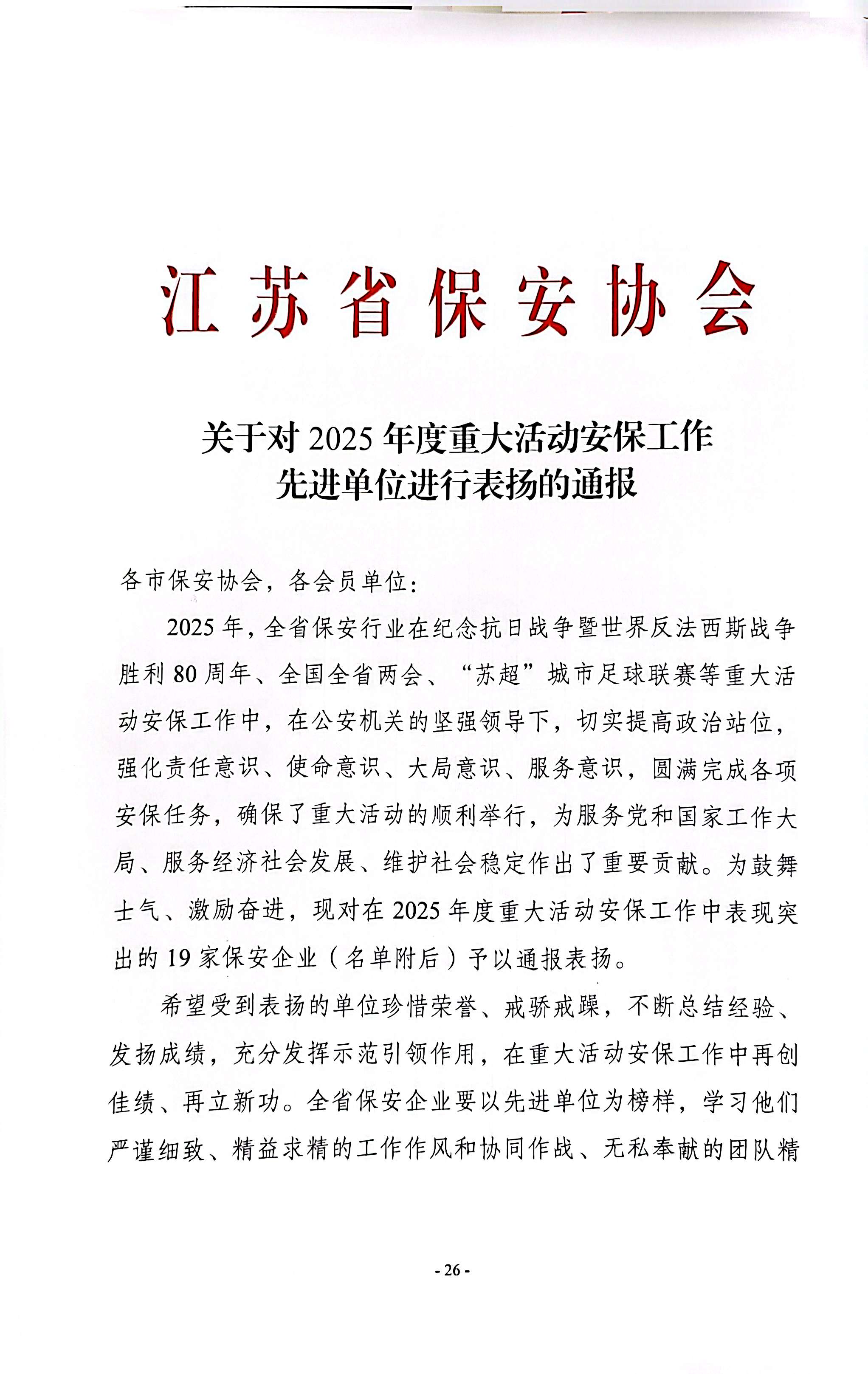 喜報(bào)!南京市保安服務(wù)有限公司榮獲“2025年度重大活動(dòng)安保工作先進(jìn)單位”稱號(hào)